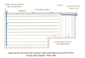It is a patented Reticulation System designed to effectively treat the area under concrete slabs, for protection against infestation by subterranean termites and around the external perimeter of structures to prevent termites entering from the outside of a building. Injection systems is installed prior to laying of the concrete slab for the internal system and externally after external work has been completed but prior to any concreting, paving etc. Chemicals are added after the concrete slab has dried and so does not expose occupants to chemicals.